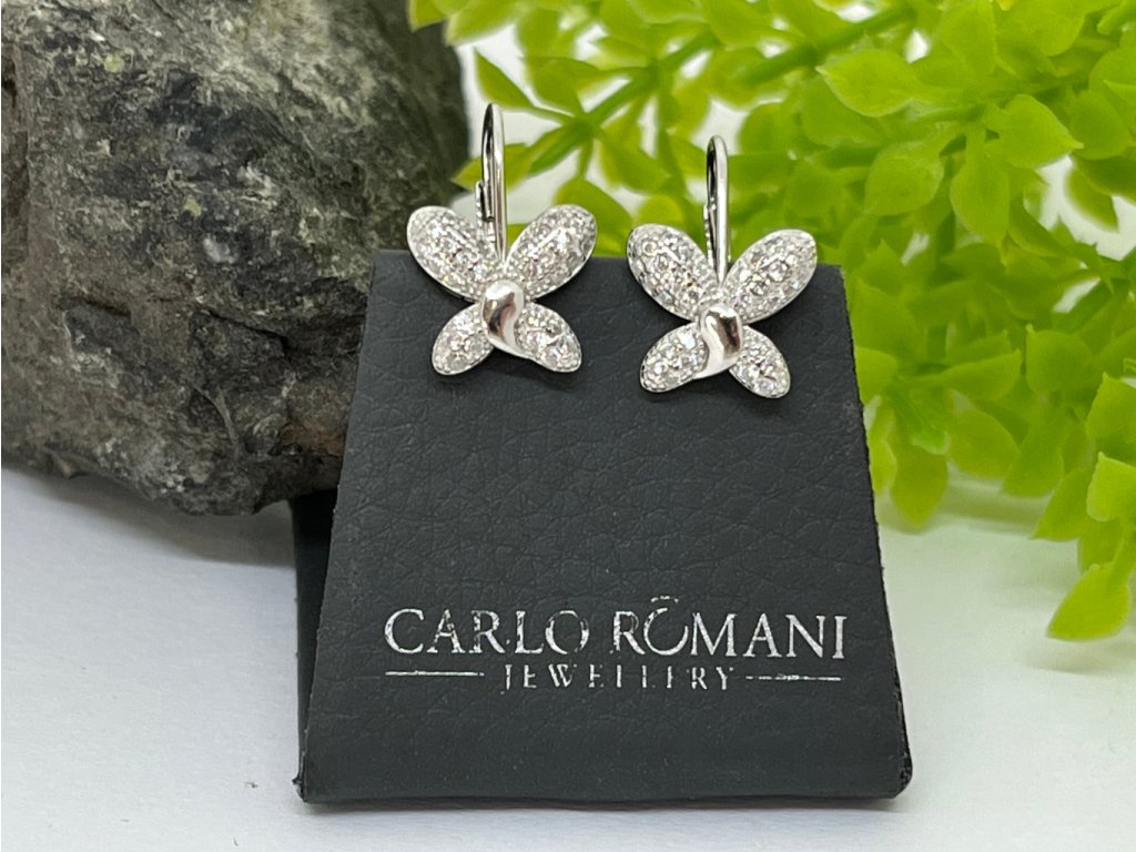 Tyto nádherné stříbrné náušnice, které připomínají křídla motýla, jsou osázené blyštivými bílými zirkony. Jakousi tajemnou krásou v sobě skrývají to nejlepší z přírody a elegance. Jsou výborné pro denní i večerní nošení a dodají vašemu outfitu tu správnou jiskru.