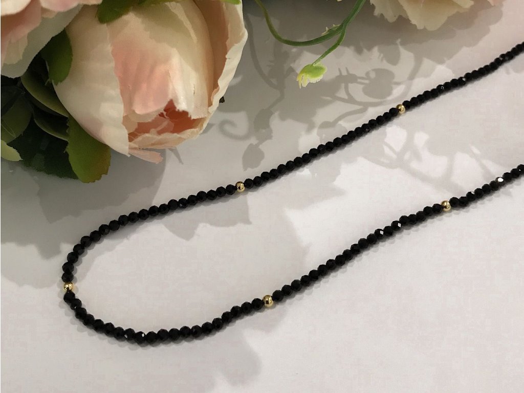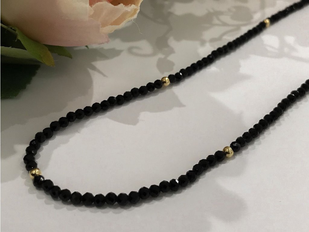 Intenzivní krása spinelu: Spinel je drahokam ceněný pro svou tvrdost a brilantní lesk, často srovnávaný s černými diamanty. Jeho sytě černá barva dodává náhrdelníku moderní a sofistikovaný vzhled.