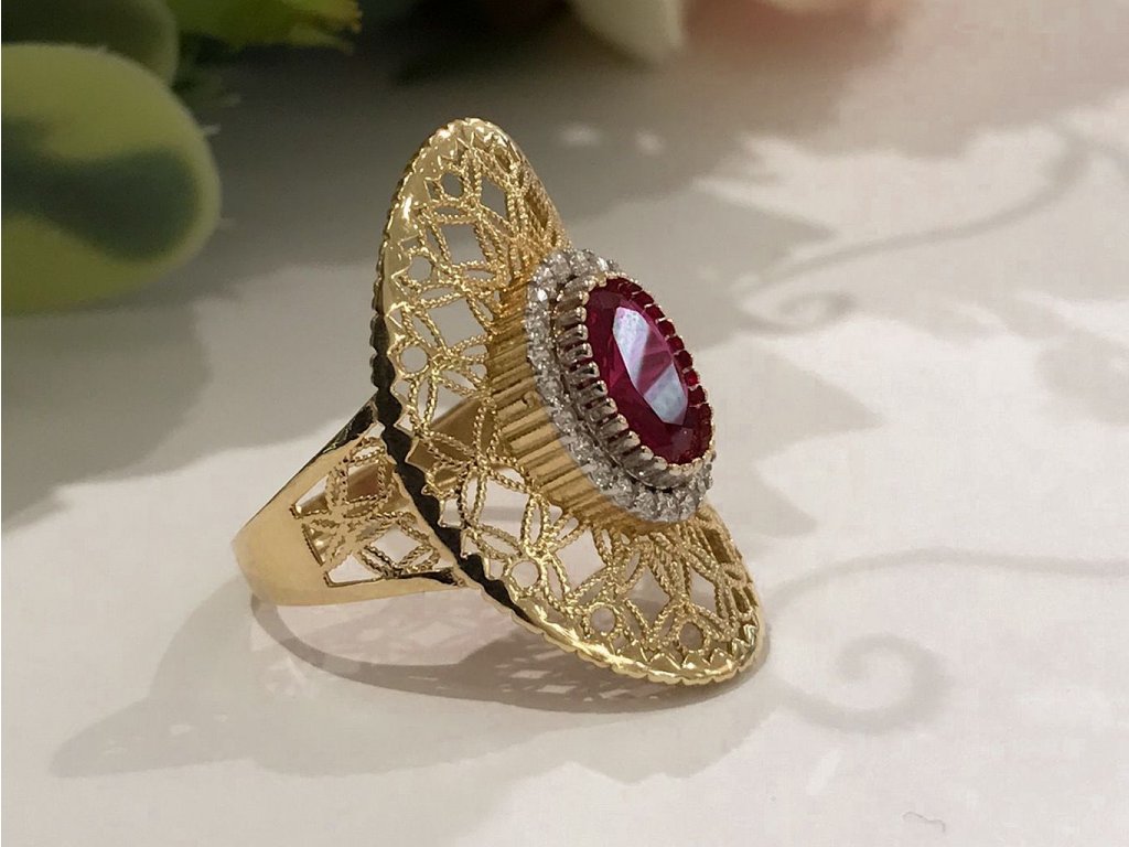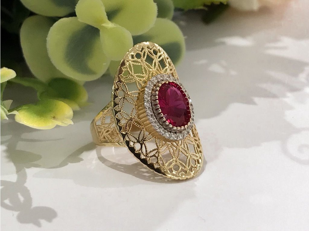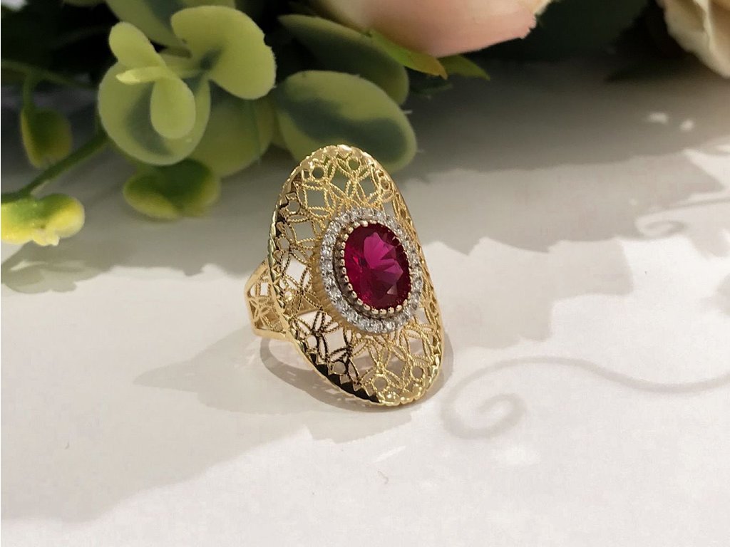 Design zlatého a výrazného prstenu je odvážný a elegantní zároveň, s robustní zlatou obroučkou, která objímá dominantní červený zirkon. Tento zirkon, zářící s hlubokou, sytou barvou a brilantním leskem, evokuje oheň a sofistikovanost. Co prsten Zorka činí skutečně jedinečným, je jeho propracovaná, filigránová obruba, která vytváří bohatou krajkovou texturu a dodává šperku nádech orientálního luxusu a vznešenosti. Je to šperk, který podtrhne sílu Vaší osobnosti a dodá Vašemu vzhledu nezapomenutelný akcent.